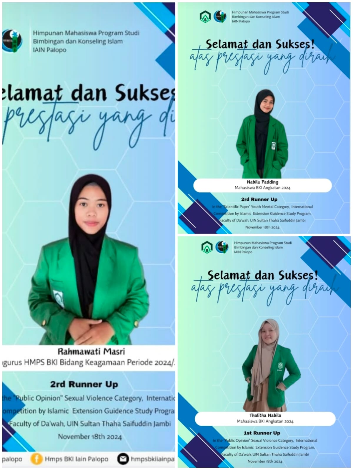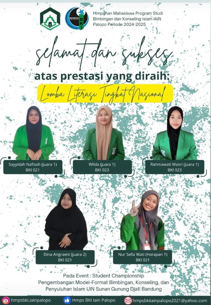 Mahasiswa BKI UIN Palopo membuktikan bahwa mereka tidak hanya unggul dalam akademik, tetapi juga aktif berkontribusi di tingkat nasional. Prestasi ini menunjukkan semangat mereka untuk terus mengembangkan kompetensi dan memperkuat peran konselor Islam dalam menjawab tantangan zaman.